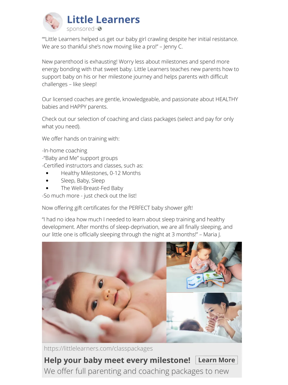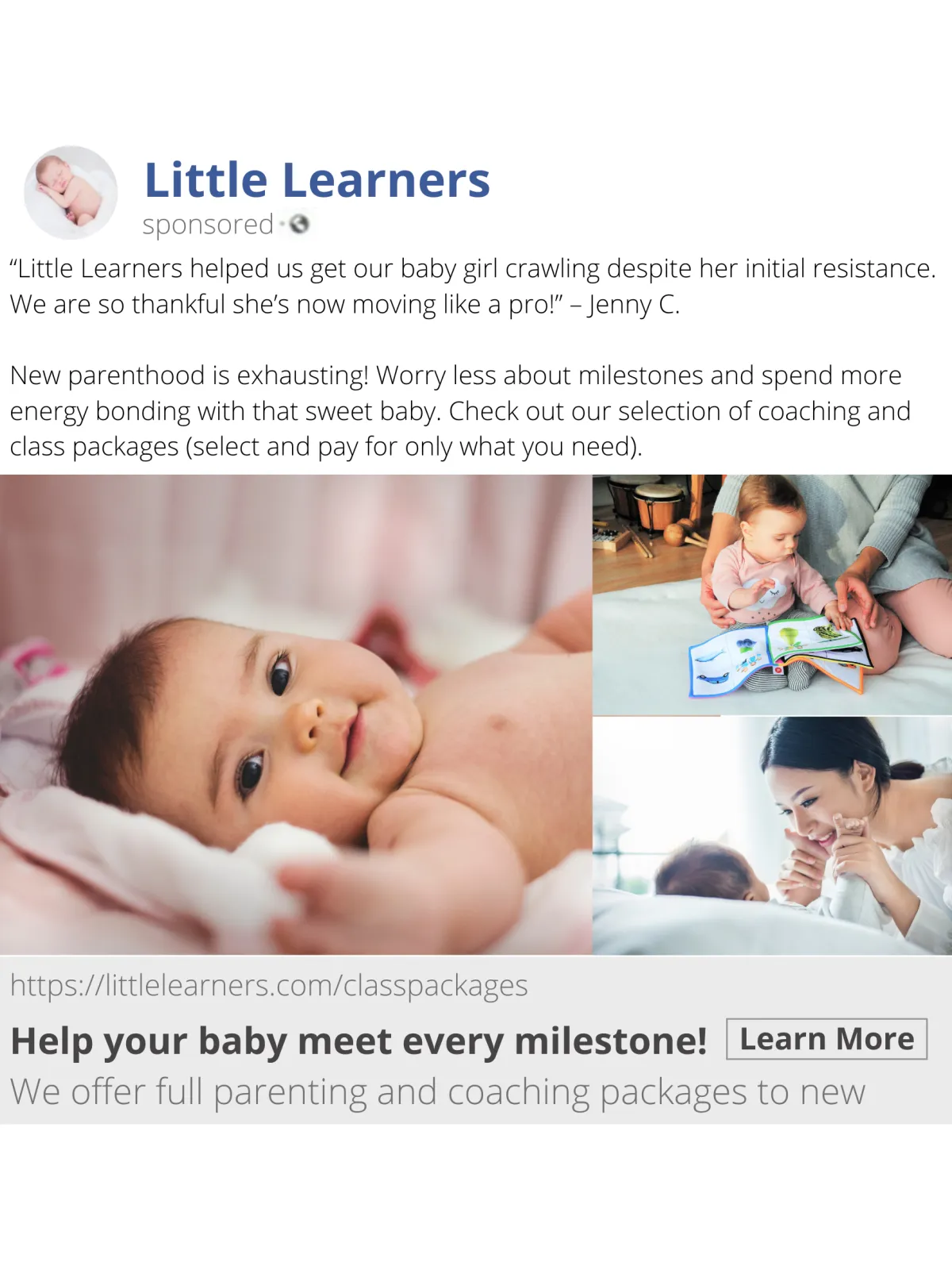 The target audience for this ad is primarily new parents, between the ages of 25 and 40, who prioritize their child's education and development from the beginning. The conversion objective is for viewers to click "learn more" and purchase directly from the landing page. However, we would also track any interactions with the ad to retarget audiences interested in these services.
